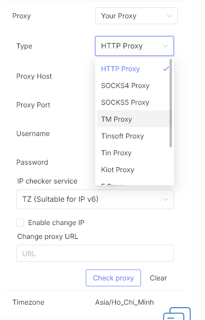 • Tích hợp proxy linh hoạt: Hỗ trợ nhiều loại proxy bao gồm HTTP, SOCKS4, SOCKS5 và TM Proxy — cho phép kết nối trực tiếp với TMProxy.