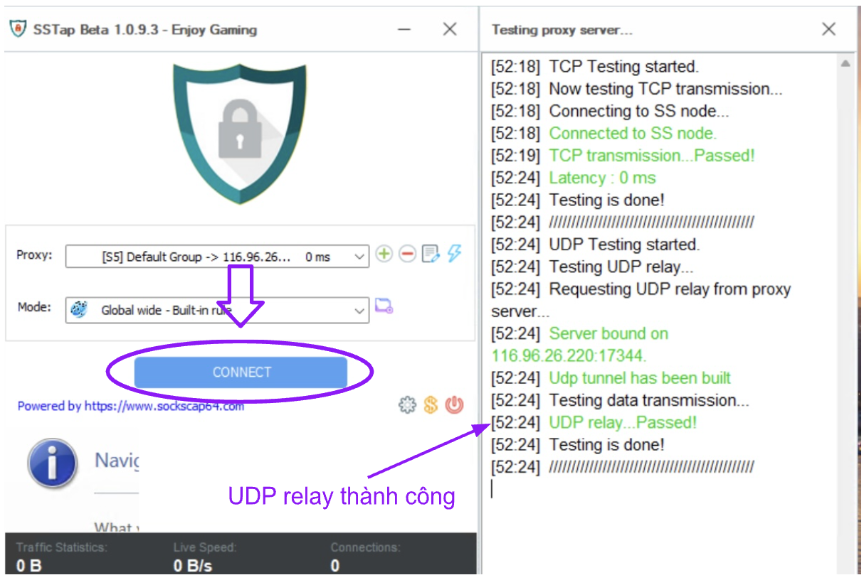 Kết nối UDP đã được thiết lập: Ứng dụng (ví dụ: game, ứng dụng VoIP, ứng dụng streaming…) đã có thể gửi và nhận dữ liệu UDP thông qua proxy/VPN server mà SSTap đang sử dụng.
